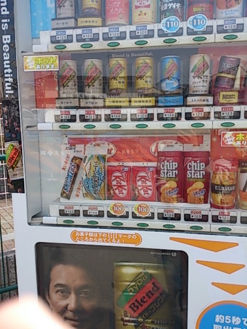 散歩の途中で、飲み物とお菓子の両方が売られている自動販売機を