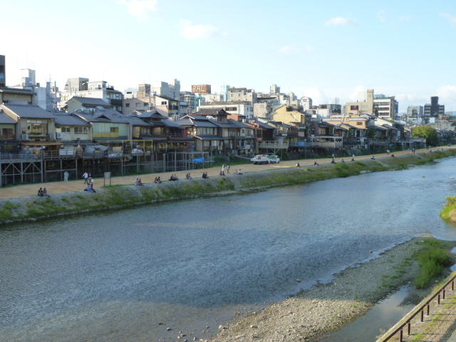 写真は、京都の名所「鴨川」と等間隔に並んだカップル(死語?)の方々です。