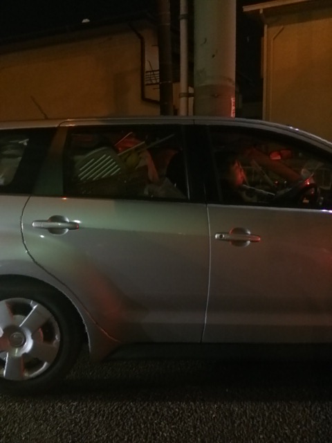 こんばんわ!!今日も天気良好でしたが少し寒い関西でした。春本番ではないようですね。3月~4月の上旬は、引越しシーズンですね。私の会社でも、引越しをする社員が何人かいましたよ。そんな中、一人の女性社員も京都の山奥から大阪市内に引っ越してまいりました。が、なんと自力で引越しをしているようで、車の中がゴミいや引越し品で満載の状態のようです。女性だけに色々と品が多いようで車の中が最悪のようです。写真は、そんな車を撮影しました。窓の所に品々が写っていますが、ルームミラーも見えない状態でした。業者を使ったほうがいいのでは…