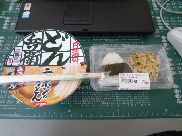 今日も昼ご飯は、「どん兵衛」「おにぎり」です。273円コースです。